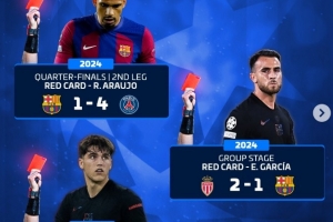 体育资讯4月15日讯 在欧冠淘汰赛次回合,巴萨2-1击败马竞,加西亚吃到红牌,这是巴萨近3个赛季在欧冠吃到的第6张红牌,以下为具体情况: