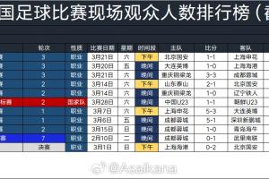 体育资讯3月29日讯 德转管理员朱艺发布了2026年中国足球比赛现场观众人数排行榜(截至3.28)。